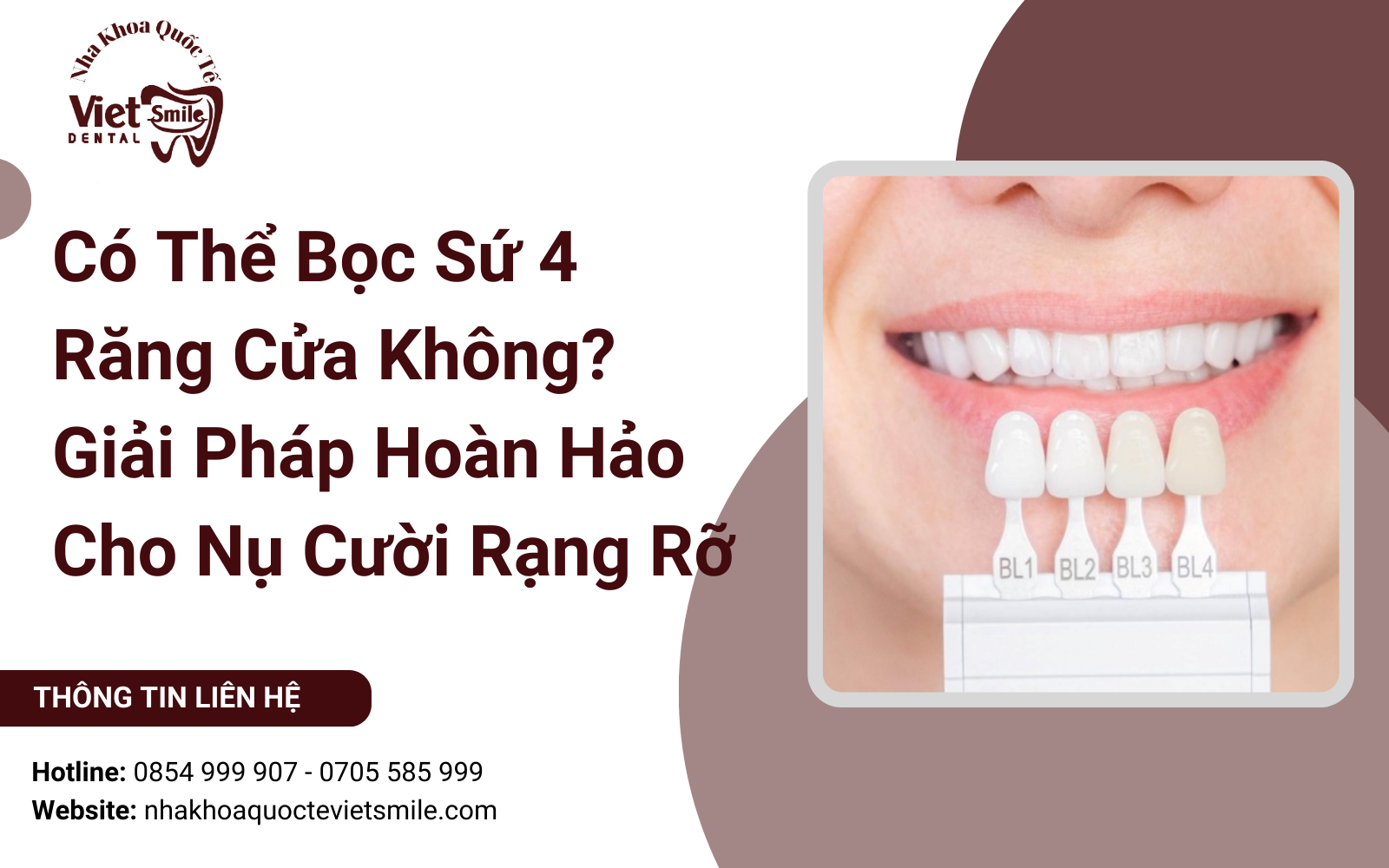 Nụ cười chính là "vũ khí" quan trọng nhất giúp chúng ta tự tin trong giao tiếp và tạo ấn tượng tốt với người đối diện. Trong đó, 4 răng cửa (bao gồm 2 răng cửa chính và 2 răng cửa bên) đóng vai trò là "mặt tiền" của toàn bộ khuôn hàm. Chỉ cần một khuyết điểm nhỏ ở vùng răng này cũng có thể khiến nụ cười kém duyên. Do đó, rất nhiều người đặt câu hỏi liệu có thể bọc sứ 4 răng cửa không hay nhất thiết phải bọc toàn hàm để đảm bảo tính thẩm mỹ? Bài viết này từ Nha khoa Quốc tế Việt Smile sẽ giải đáp chi tiết mọi thắc mắc của bạn.